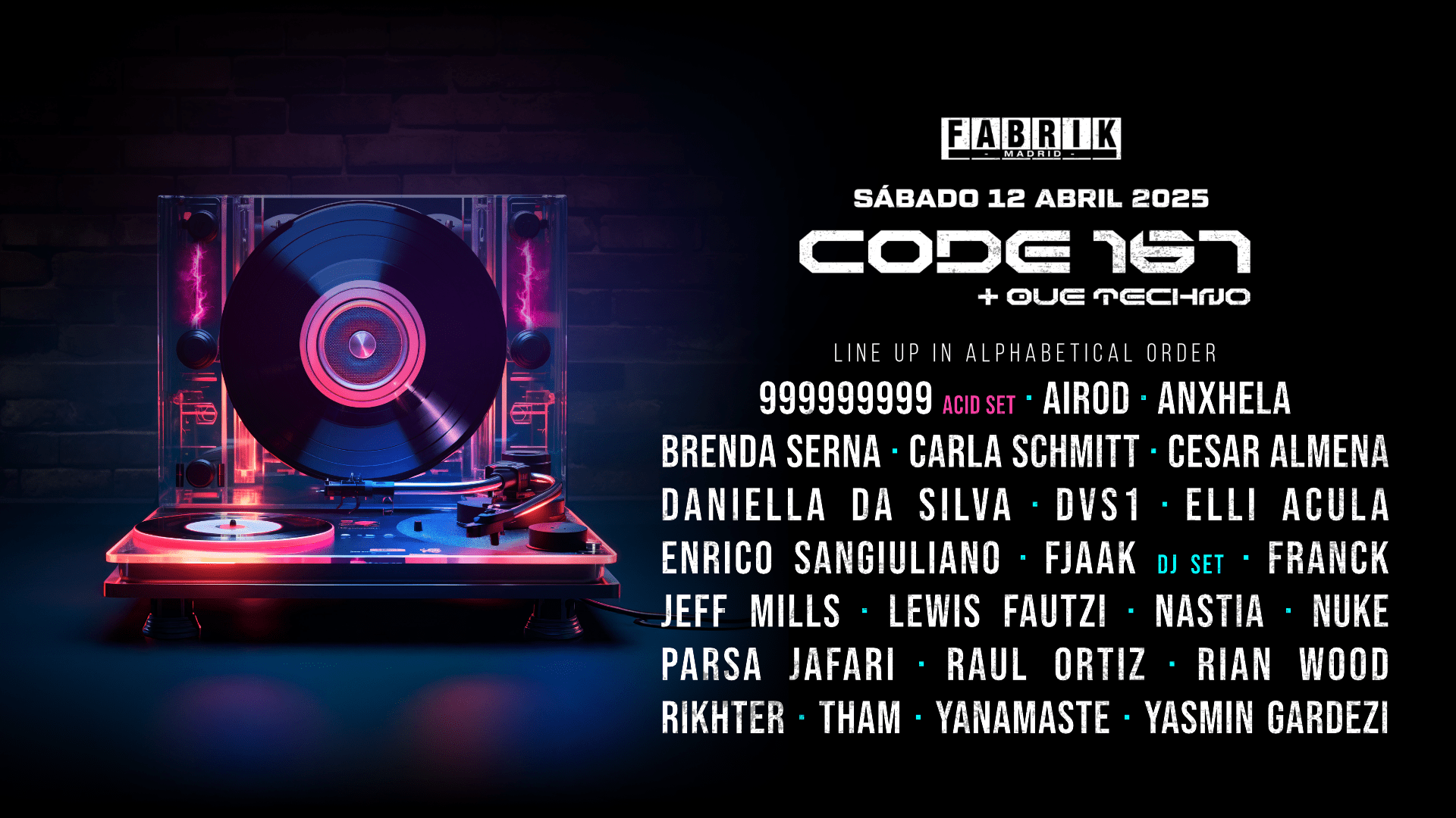 CODE 167 ATERRIZA ESTE SÁBADO EN FABRIK CON JEFF MILLS, 999999999, ENRICO SANGIULIANO ENTRE MUCHOS OTROS